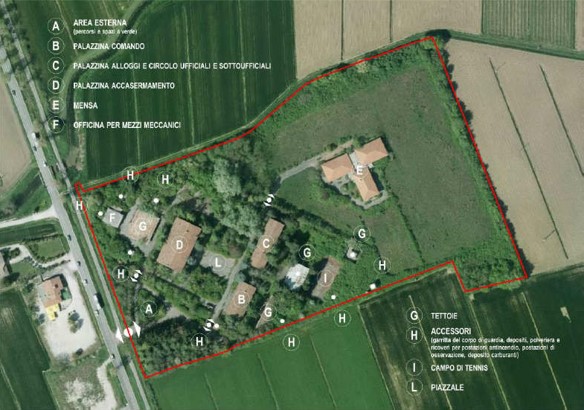 L’ex caserma è costituita da un complesso di quattro fabbricati principali ed altri edifici accessori originariamente adibiti a deposito e logistica, oltre a tettoie metalliche, un campo da tennis, un ampio spazio scoperto pertinenziale a verde e viali per spazi di manovra. Il compendio insiste su una superficie catastale di 47.822 mq, per la maggior parte recintata.