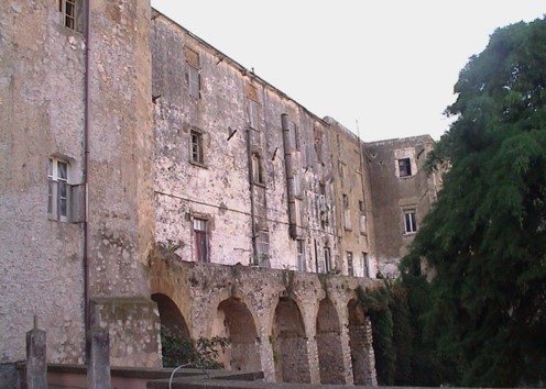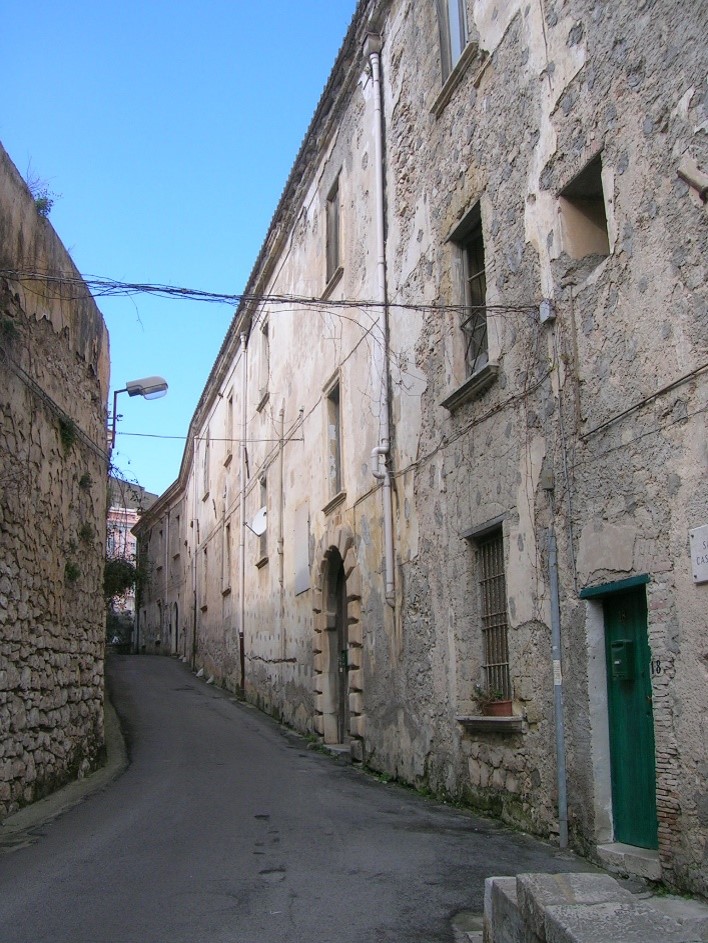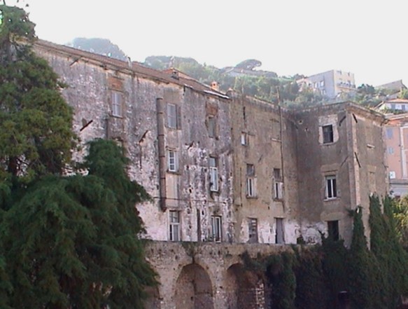 Il fabbricato è formato da quattro livelli uno interrato e tre fuori terra e da una corte esterna in linea con il fabbricato adiacente di via Angioina. Si affaccia per tutta la lunghezza (circa 65 metri) su via Angioina dove si trovano gli ingressi principali originari con cornici e imbotti bugnati in pietra. Dalla parte opposta, verso il mare, corre un terrazzo realizzato sopra alti contrafforti. All’interno uno scalone a tutta altezza che mette in comunicazione i vari piani con arcate su pianerottoli e gradini rivestiti in pietra.