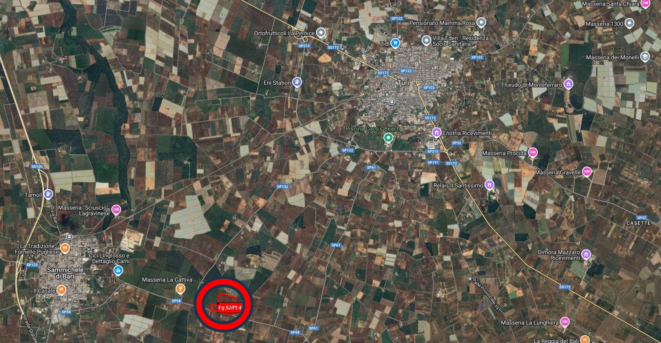 Il compendio è sito nel Comune di Turi sulla strada provinciale n. 58 «Sammichele – Putignano» in zona denominata «Masseria il Regio» ad indirizzo produttivo prevalentemente agricola. Pur ricadendo nel territorio comunale di Turi risulta ai limiti dei confini comunale dell’abitato di Sammichele di Bari da cui dista Km 2,5.