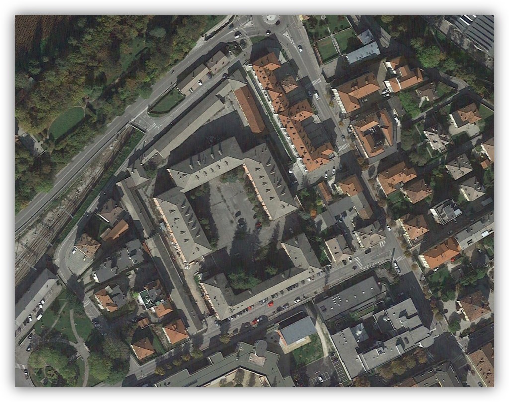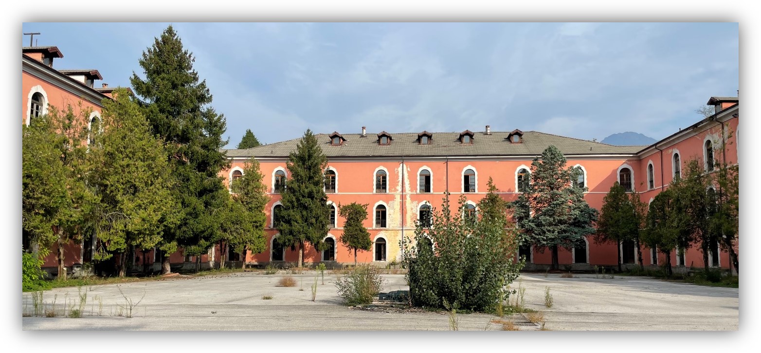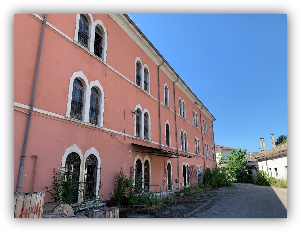 L’immobile non più funzionale alle esigenze proprie della Difesa, è formato da due edifici con pianta a “C” tra loro contrapposti che racchiudono un ampio spazio scoperto – la piazza d’armi – e da tre edifici più bassi, principalmente a un piano fuori terra, dove erano collocati i servizi quali cucina, sala mensa, officine, ricovero mezzi e altri vani funzionali all’ex compendio, distribuiti a perimetro lungo tutto il fronte nord, lungo buona parte del fronte ovest, e lungo un breve tratto del fronte est.