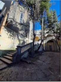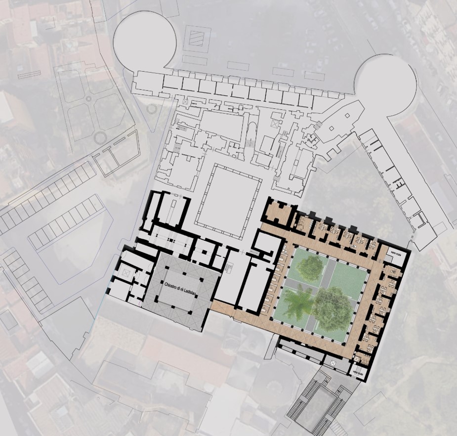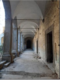 La porzione immobiliare si sviluppa su tre livelli (piano seminterrato, piano primo e piano secondo), con scala monumentale d’accesso, due chiostri ed un giardino. Al piano primo sono presenti il Chiostro Porteria ed il Chiostro Ladislao, gli spazi coperti ad essi connessi, due vani scala rispettivamente nell’angolo nord-est e sud-est. Gli ambienti interni del primo e secondo piano sono caratterizzati da solai in legno, infissi e porte in legno, e prospettano su di ampi porticati che si affacciano sui Chiostri. I porticati dei due chiostri hanno una conformazione architettonica degli elementi orizzontali che varia dalla volta a botte, alla volta a crociera fino al solaio piano di tipo misto con putrelle e tavelloni nelle aree che hanno subito interventi manutentivi. La restante maggior consistenza del bene è in uso al Ministero della Giustizia quale sede del Giudice di Pace.