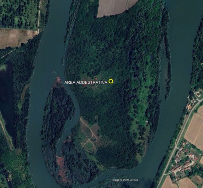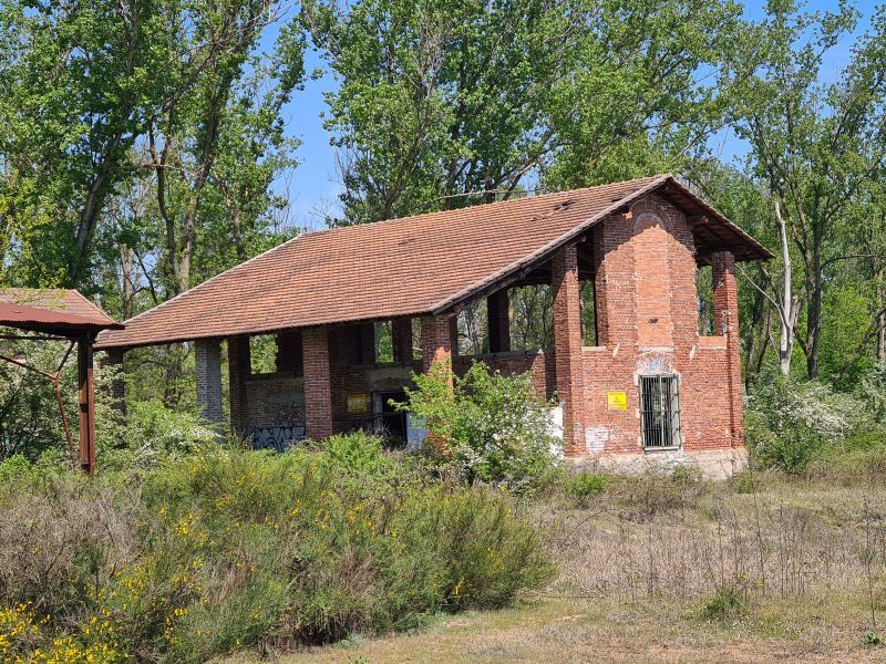 Il complesso, utilizzato sino al 1991 come area addestrativa dall’Esercito Italiano, è costituito da un’ampia area boschiva circondata su tre lati dal meandro del fiume Ticino e su cui insistono, in zona quasi centrale due fabbricati e due tettoie con relativa area pertinenziale recintata. Il sito non risulta delimitato nel suo contorno ed è di facile accesso in quanto la sbarra in ferro posta all’ingresso del compendio è in disuso. La strada d’accesso è carrabile sino alla recinzione che delimita l’area di pertinenza dei fabbricati e prosegue in un sentiero ciclopedonale che costituisce, come indicato dai cartelli lungo il percorso, porzione del tratto P8 del sentiero “Anello di Santa Sofia” gestito dal Consorzio Parco Lombardo della Valle del Ticino, incorniciato in una ricca e rigogliosa vegetazione spontanea ed alberi d’alto fusto. Il sentiero permette di raggiungere l’area di demanio pubblico adibita costituita da una spiaggia in terra bianca posta lungo la sponda del fiume Ticino. La porzione di compendio dove insistono i fabbricati è delimitata da paletti in ferro con agganciata recinzione in rete metallica che tuttavia risulta forzata sia in prossimità del cancello principale d’accesso che in altri punti. Il corpo di fabbrica principale, a due elevazioni fuori terra, presenta le caratteristiche tipiche di un fienile: un unico ampio vano a piano terra con antistante portico che costituisce il prolungamento strutturale della sovrastante tettoia. La struttura è costituita da mattoni pieni, il piano di calpestio è in cemento e la copertura è realizzata con capriate, correnti e listelli in legno e manto di copertura in tegole tipo marsigliesi. Il solaio di interpiano è del tipo misto con voltine. Gli infissi esterni sono in legno e protetti da inferriata. Il piano superiore non è servito da scala. Il fabbricato accessorio, anch’esso a due elevazioni fuori terra, presenta invece le caratteristiche costruttive di una abitazione con a piano terra ingresso su vano principale, scala centrale, bagno e piccolo vano retrostante, mentre il piano primo, raggiungibile tramite una ripida rampa di scala in muratura, è costituito da un unico ambiente diviso dal vano scala a giorno. La struttura è in muratura rivestita da elementi in pietra, il pavimento è in scaglie di marmo e la copertura è in legno con manto di copertura in tegole tipo marsigliesi. Il solaio di interpiano è del tipo misto con voltine. Gli infissi esterni (dove presenti) sono in legno e protetti da inferriata. La porta d’ingresso è stata divelta. Le due tettoie presentano le stesse caratteristiche costruttive: struttura portante e secondaria in profili metallici tipo IPE e manto in ondulina.
