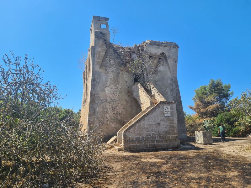 Fu edificata probabilmente nella seconda metà del XVI secolo, ha una struttura in muratura di conci regolari a faccia vista, più volte rimaneggiata, con due feritoie rettangolari inserite nei barbacani del piombatoio centrale che nel corso degli ultimi anni hanno mutato funzione diventando a tutti gli effetti delle finestre. Le caditoie, dovevano servire come postazioni dalle quali scagliare pietre, olio o pece bollente o altri materiali, addosso agli eventuali assalitori. Un grosso elemento toroidale è all’apice di queste ultime, cui segue una merlatura per l’appostamento delle artiglierie. Sul terrazzo è presente un vano diruto con relativa finestra. Verso il lato monte, è presente una scala in pietra, su arco rampante, caratteristica molto rara per una torre del regno; in prossimità del suddetto vano scala è stato realizzato un pozzo privo di chiusura, al cui interno è presente vegetazione spontanea. Sul lato sud non è presente alcuna apertura. Il materiale utilizzato è quello tipico per queste strutture, conci regolari agli spigoli e pietrame informe per le parti centrali.
