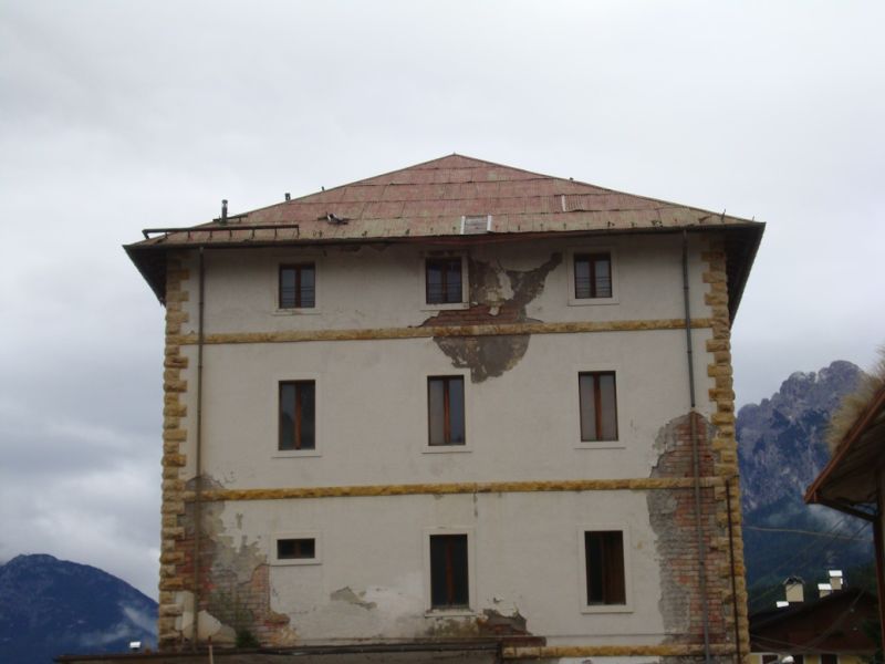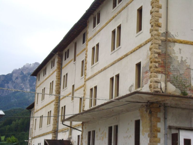 L'ex caserma fu edificata dall'autorità militare nel 1940-41su terreni in parte espropriati ed in parte già alveo del torrente Padola. Il corpo princiapale a forma rettangolare si sviluppa in quattro piani fuori terra ed uno seminterrato. I prospetti sono molto lineari e classici per l'utilizzo a caserma. La copertura è realizzata seguendo la tipica struttura lignea del posto e con manto di copertura metallico. Il fabbricato adiacente è di due piani fuori terra con tetto a falde e copertura in tegole. Gli altri edifici minori risultano privi di elementi di pregio architettonico.