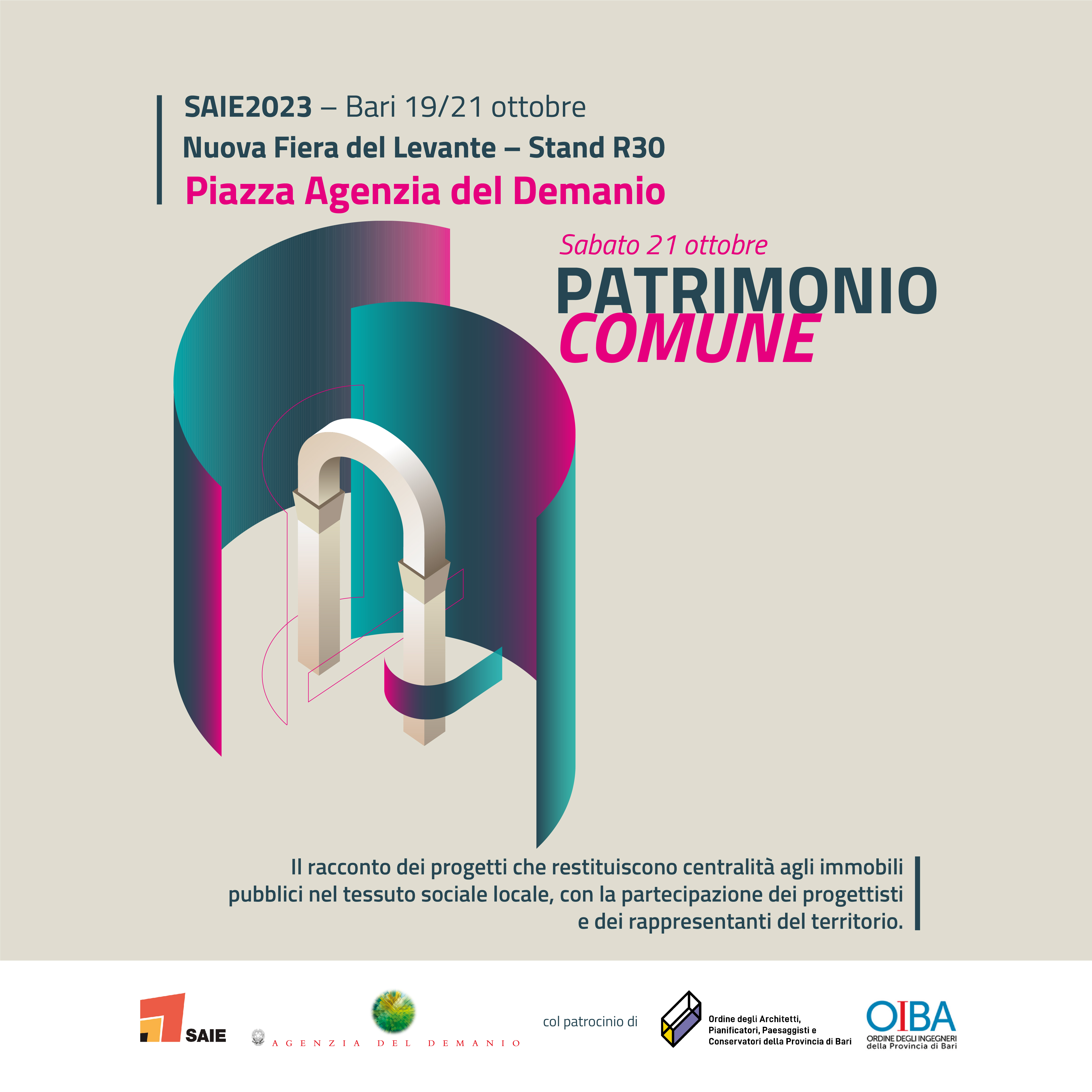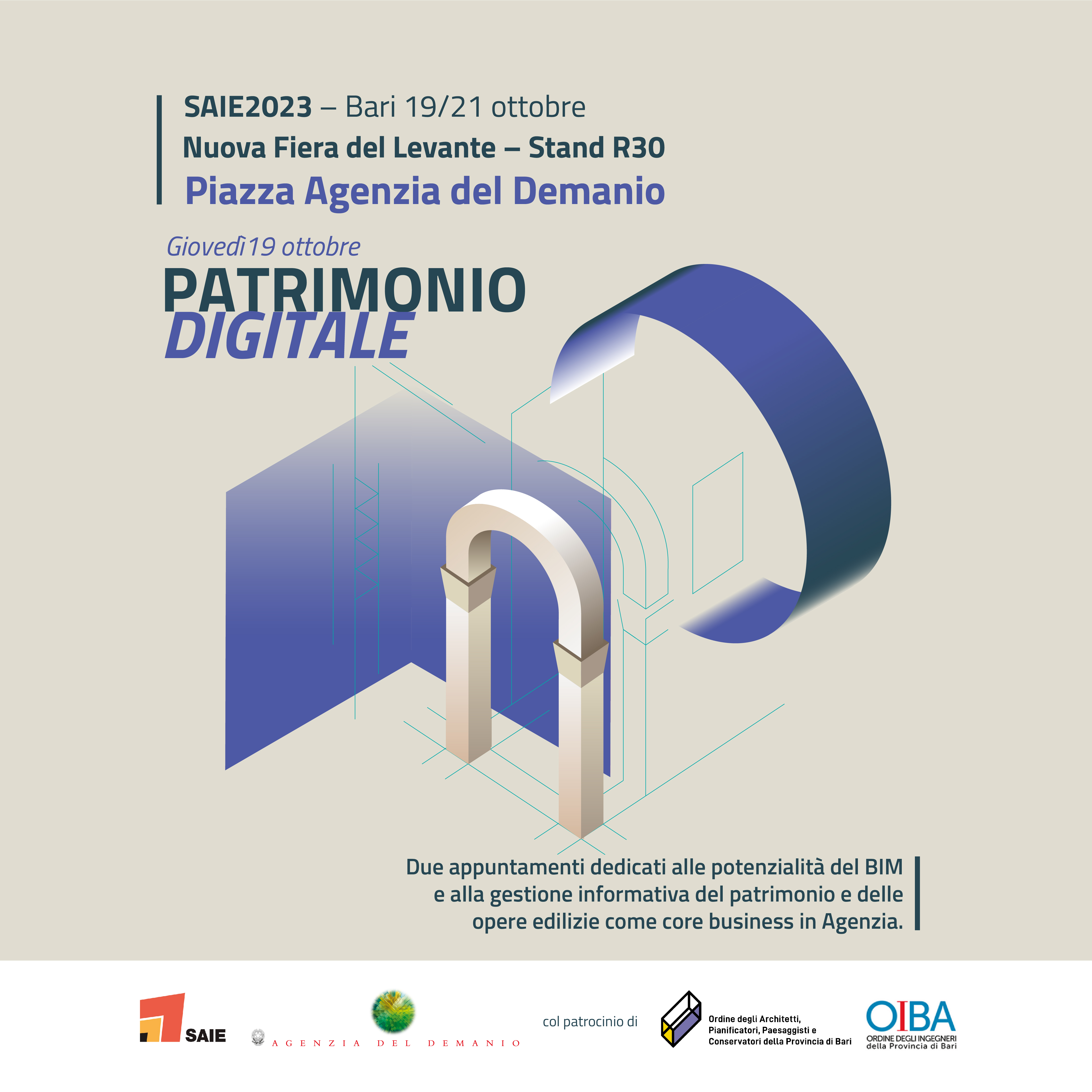 L'Agenzia del Demanio partecipa alla fiera SAIE, appuntamento annuale dove imprese, professionisti e associazioni si incontrano e si confrontano per lo sviluppo della filiera delle costruzioni. Un’occasione di business e networking per una community formata da oltre 260.000 professionisti. Un evento che mira a connettere gli operatori del settore e scoprire l’eccellenza di tutta la filiera delle costruzioni, attraverso percorsi dedicati ai temi chiave di SAIE: cantiere, sostenibilità, efficienza energetica, digitalizzazione, integrazione edificio-impianto, nuove esigenze dell’abitare e del costruire.