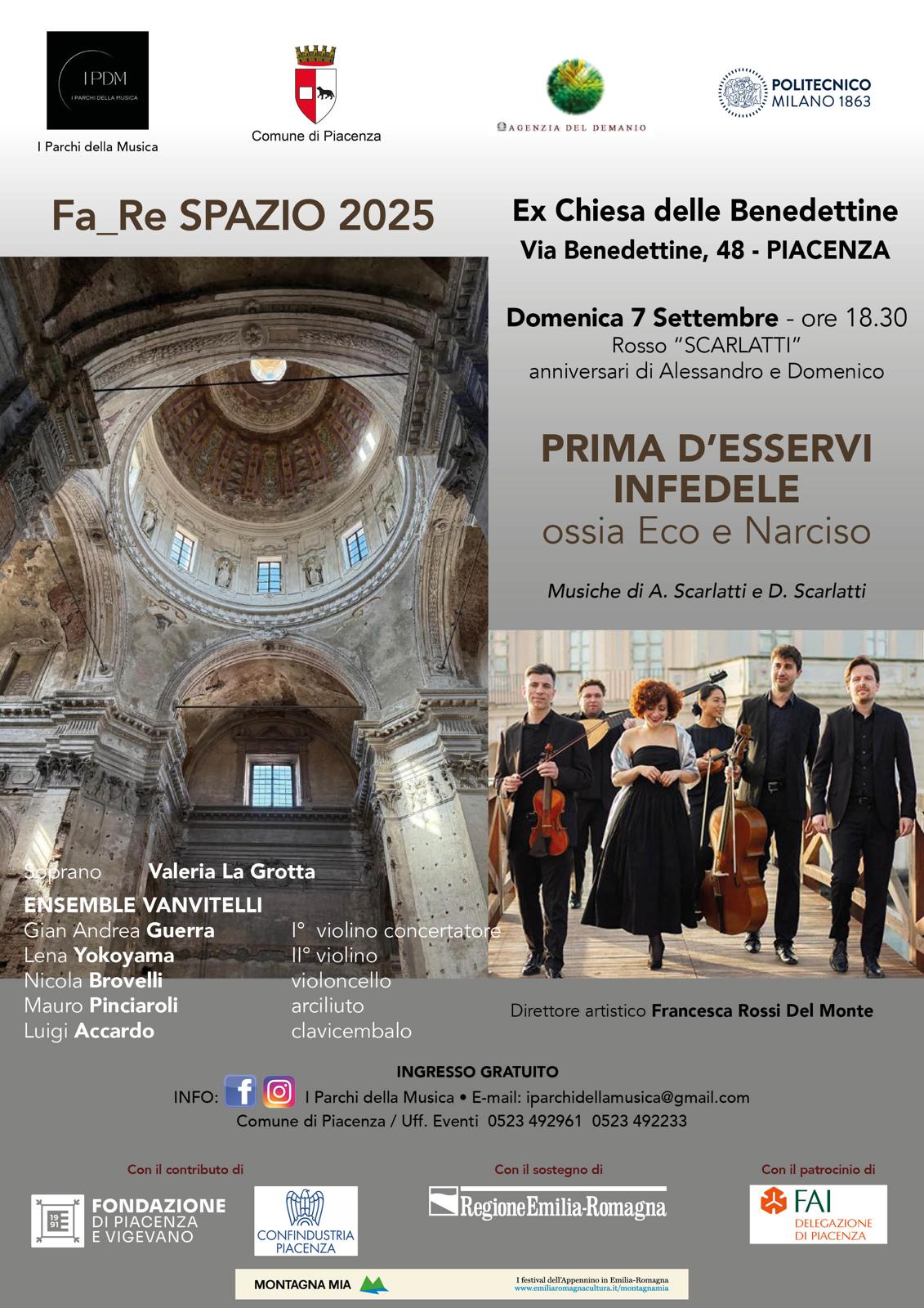 Domenica 7 settembre l’ex chiesa delle Benedettine di Piacenza ha aperto eccezionalmente al pubblico per ospitare un evento culturale promosso dall’associazione “I Parchi della Musica”, in collaborazione con l’Agenzia del Demanio, il Comune e il Politecnico di Milano. Il concerto, a ingresso libero, intitolato “Prima d’esservi infedele - ossia Eco e Narciso”, ha reso omaggio ai compositori Alessandro e Domenico Scarlatti. L’iniziativa rientra nella sezione “FA_RE SPAZIO” del Festival dei Parchi della Musica, che propone spettacoli in luoghi solitamente chiusi o non accessibili, che nel corso degli anni hanno avuto destinazioni d’uso diverse.
